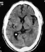 20% of strokes are hemorrhagic stroke which is due to hemorrhagic transformation of ischemic infarct in 15% of cases; in 10%, it is "spontaneous" intraparenchymal hematoma.. Hemorrhagic infarction may vary from patchy petechial bleeding to more confluent hemorrhages, representing multifocal extravasation of blood from capillaries or venules. An intraparanchymal hemorrhage occurs when a diseased artery within the brain ruptures, flooding the surrounding brain tissue with blood.  The major risk factor for intraparenchymal hemorrhage is hypertension.  Most signs and symptoms associated with intracerebral hemorrhage are caused by the compression of brain structures and blood vessels. There are certain features on CT that help characterize these two types. On CT, hemorrhagic infarction appears as a discontinuous heterogeneous mixture of high and low densities occurring within the vascular territory of the infarct.  In contrast, intraparenchymal hemorrhage appears as a discrete, homogeneous collection of blood that often exerts mass effect and may extend beyond the original infarct boundaries or even into the ventricles.